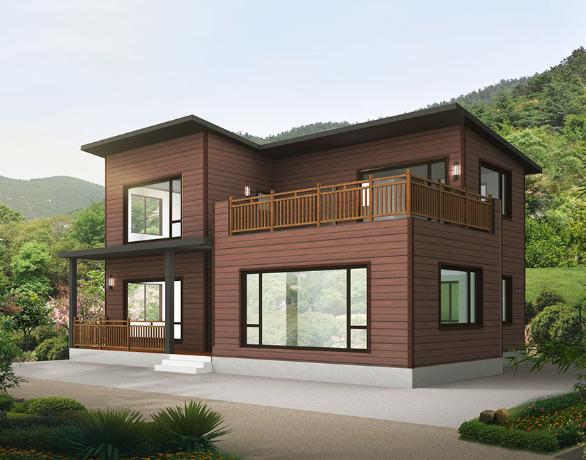 配套建筑部品:整體為輕鋼結構,屋面多彩瀝青瓦+卷材防水(材料可選),外墻用水泥纖維掛板再刷涂料(材料可選),石膏板內墻(材料可選),鋁合金門窗(材料可選)。
