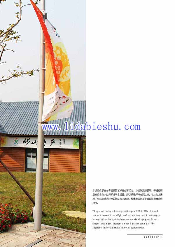 本項(xiàng)目位于青島市世界園藝博覽會(huì)園區(qū)內(nèi),功能作為茶餐廳。普通輕鋼別墅的小跨小空間不適于本項(xiàng)目。所以設(shè)計(jì)師考慮到這點(diǎn),在結(jié)構(gòu)上采用了可以承受大跨度的鋼結(jié)構(gòu)來(lái)建造。墻體做法則與普通輕鋼別墅大致相同。